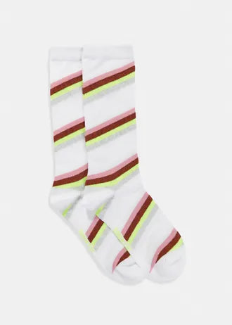 Chaussettes mi-mollet arborant un motif joyeux de rayures, dont certaines sont rehaussées de lurex brillant. Avec leur bord extensible confortable, ces chaussettes apporteront une touche de joie et de brillance à vos tenues.