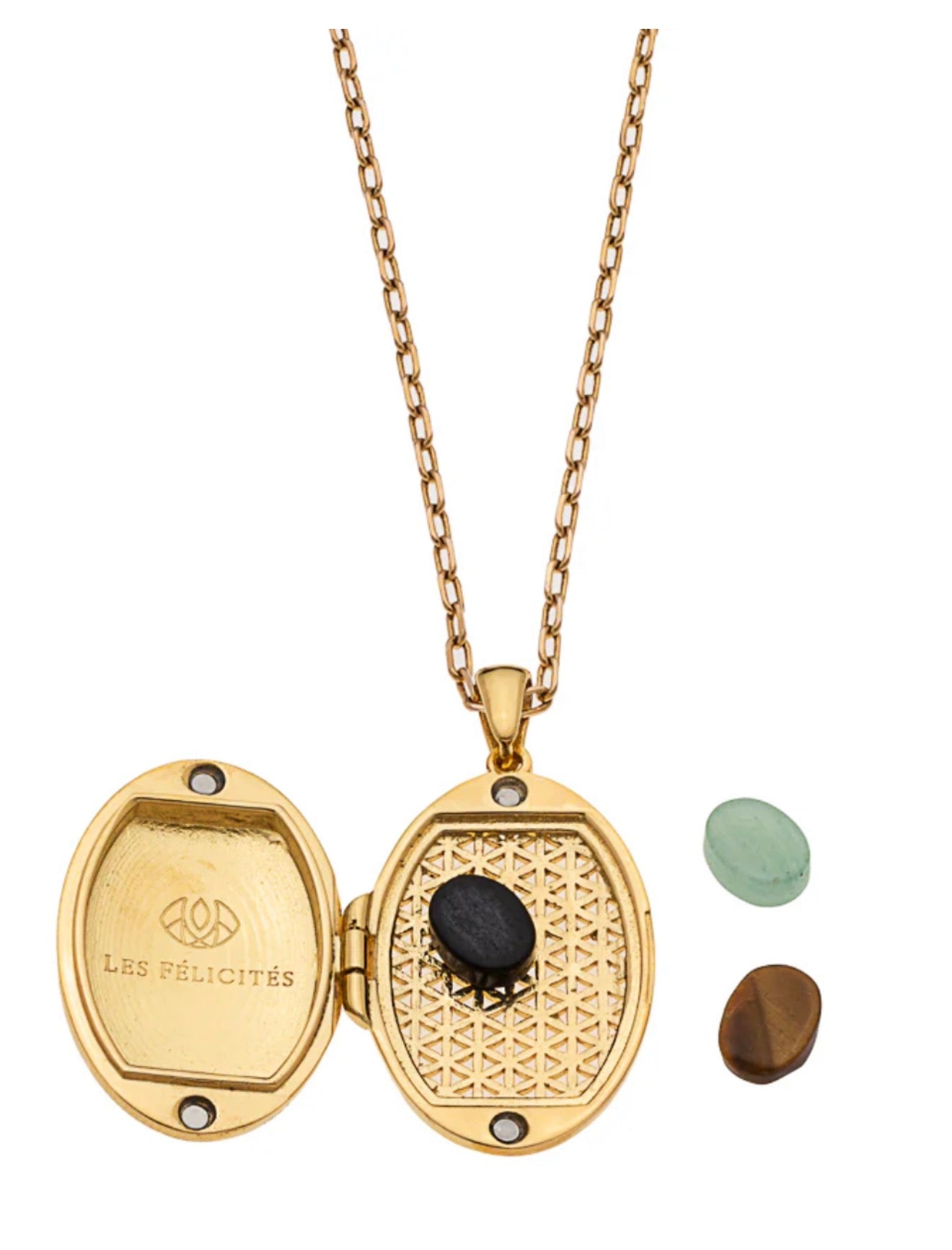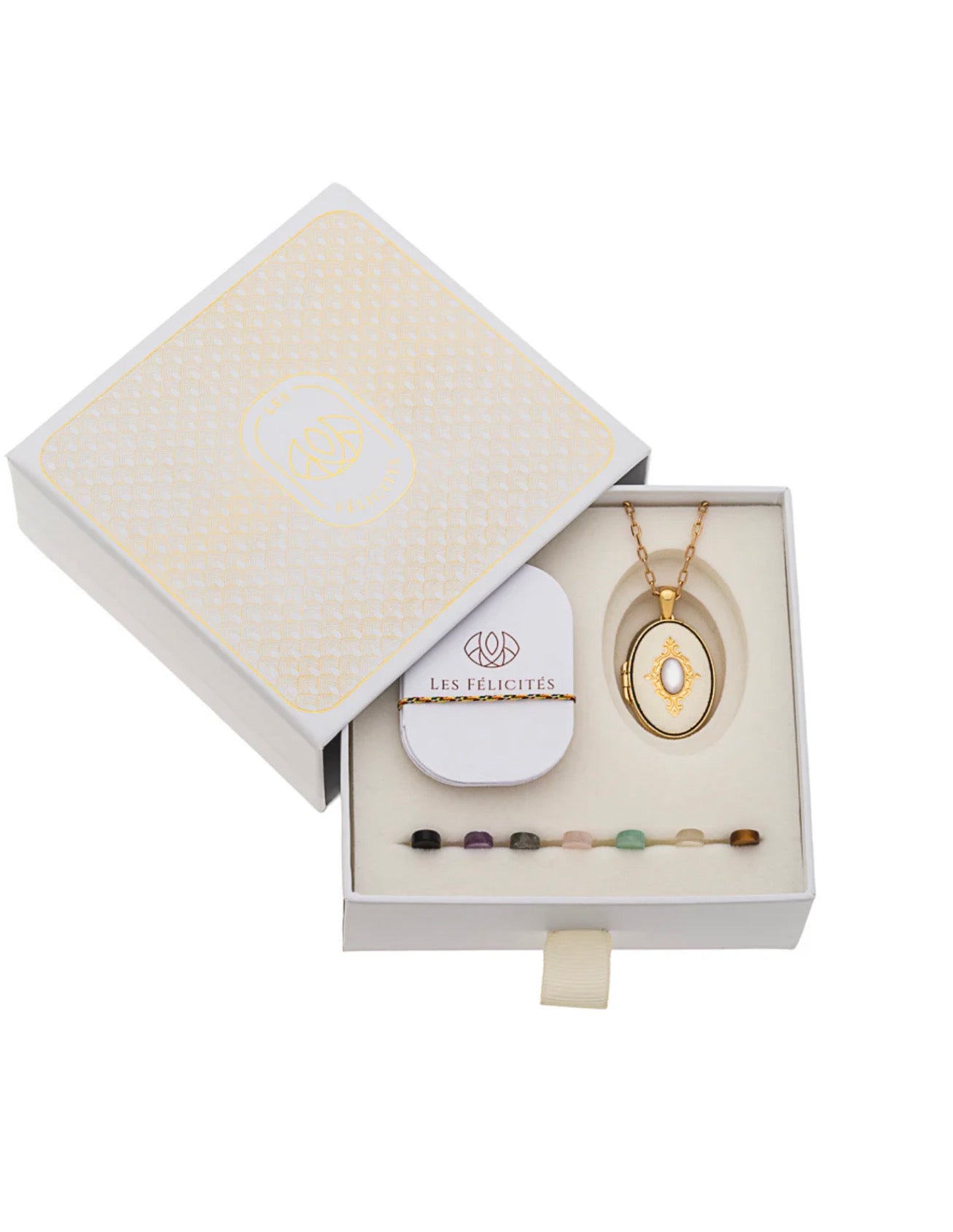 Coffret composé d'un médaillon sans chaîne, de sept pierres de protection et d'un livret expliquant les vertus de chacune.