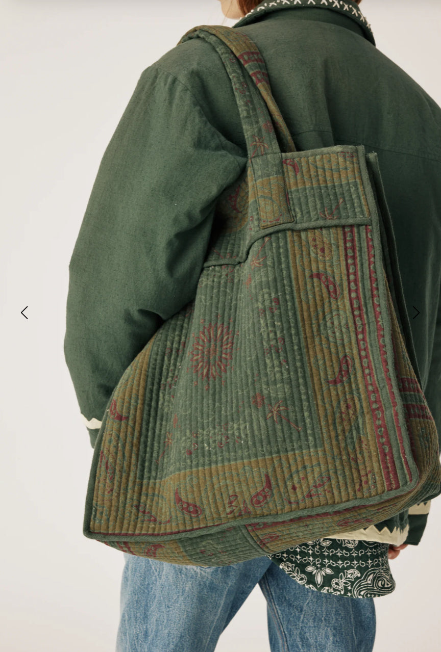 Sac fourre-tout matelassé en coton imprimé dans un format pratique. Son design bohème vert en fait un incontournable polyvalent, parfait pour la vie de tous les jours ou les escapades de week-end.