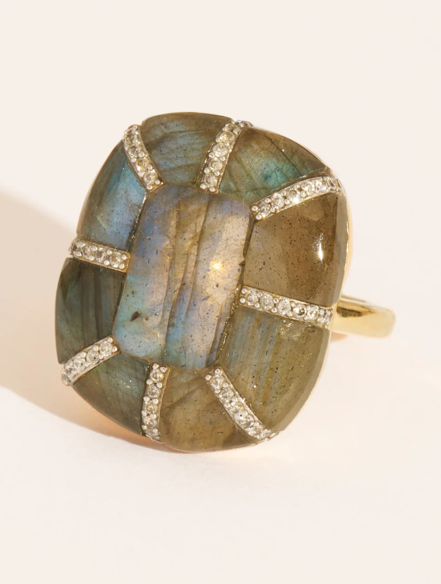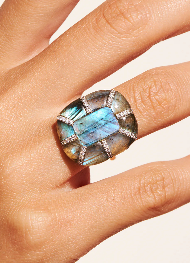 Courbes généreuses, lignes hexagonales, détails travaillés ; la somptueuse bague Reem en Labradorite est autant une prouesse technique qu'une merveille esthétique. En empruntant ses formes XXL à celles d’une fleur en pleine éclosion, elle laisse rayonner son savoir-faire exceptionnel, ses multiples zircons et ses fines pierres naturelles. Découpées neuf fois puis polies à la main, ces cabochons mettent ainsi royalement en avant les reflets, textures, tonalités et particularités de ce bijou hors du commun.