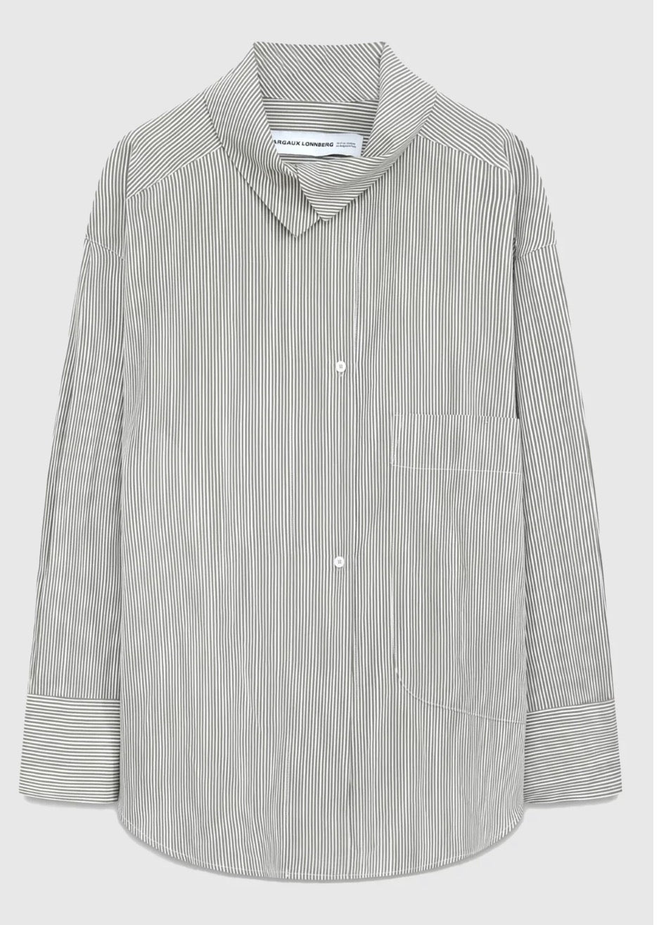 Margaux Lonnberg – Chemise FINLAY, chemise blanche à rayures, coupe ample et oversize. Col pointu asymétrique, manches longues à poignets carrés boutonnés. Grande poche plaquée sur le devant avec un empiècement dos avec pli rond.