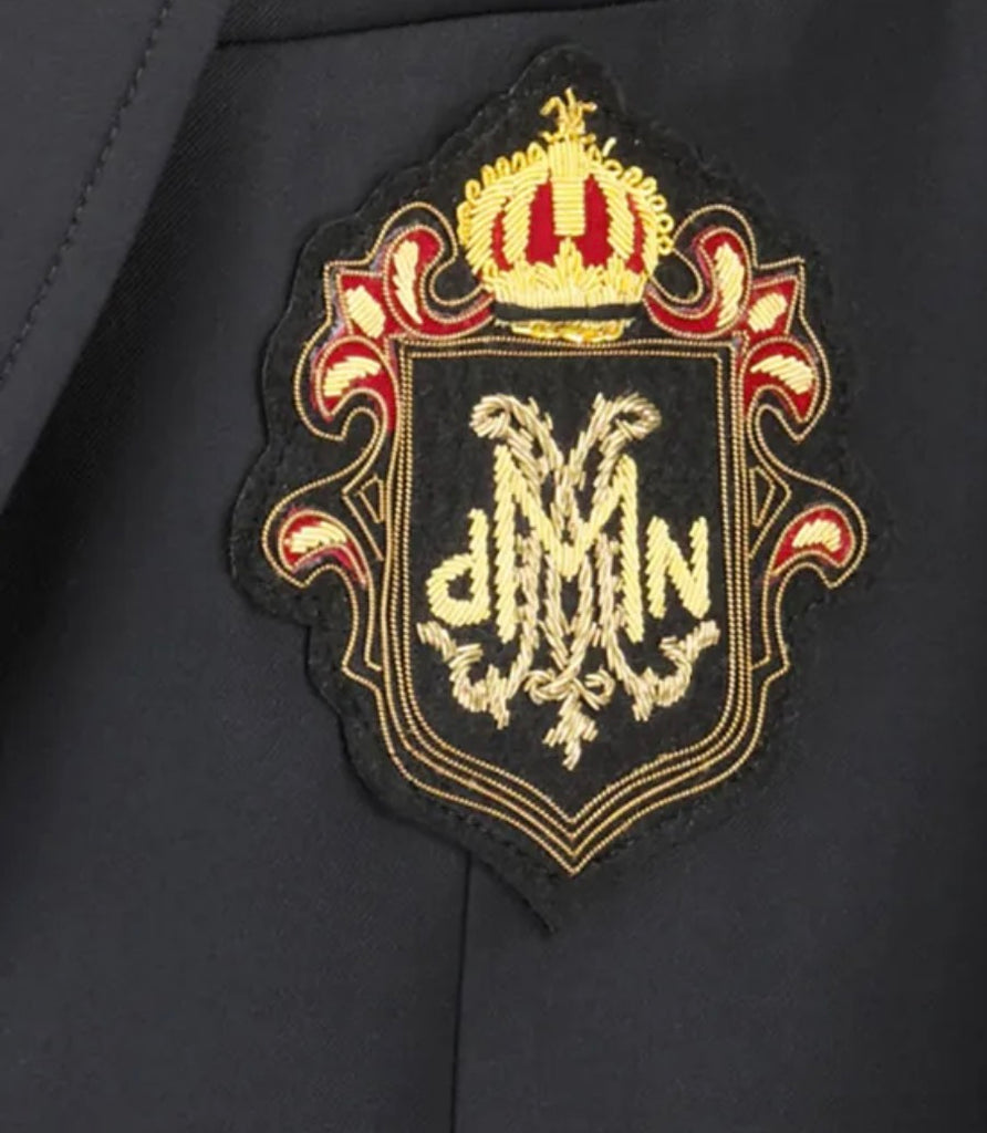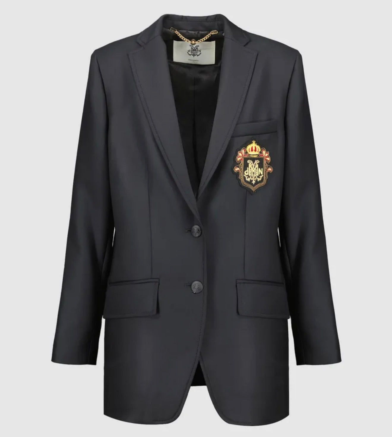 Blazer en laine noir. Ecusson de la marque brodé sur la poitrine. Col tailleur cranté fermé par boutons sur le devant. Manches longues boutonnées aux poignets. Deux poches à rabats sur le devant et une poche raglan sur la poitrine. coupe droite. Base droite.