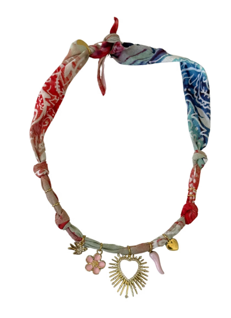 Collier en Bandana de coton rouge/violet imprimé unique imaginé par nos soins et ses grigris: mini hirondelle, fleur rose, cœur étincelant , piment rose et mini cœur doré. se noue autour du cou, du poignet ou de la cheville. longueur ~ 60 cm