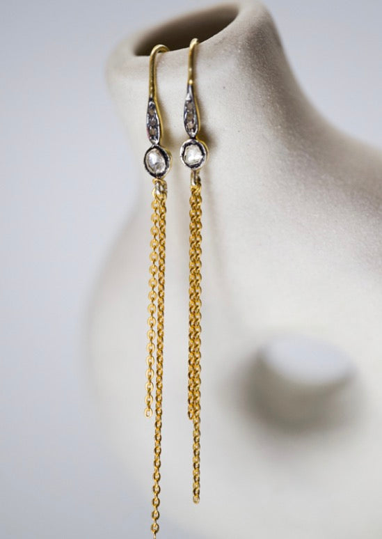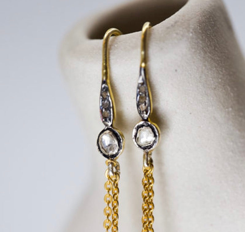 Ces boucles d’oreilles sont en argent poinçonnées et montées de diamants bruts, puis dorées à l’or fin, 24 carats.
