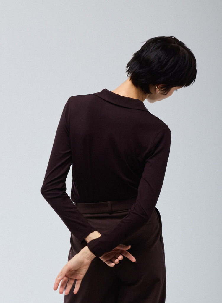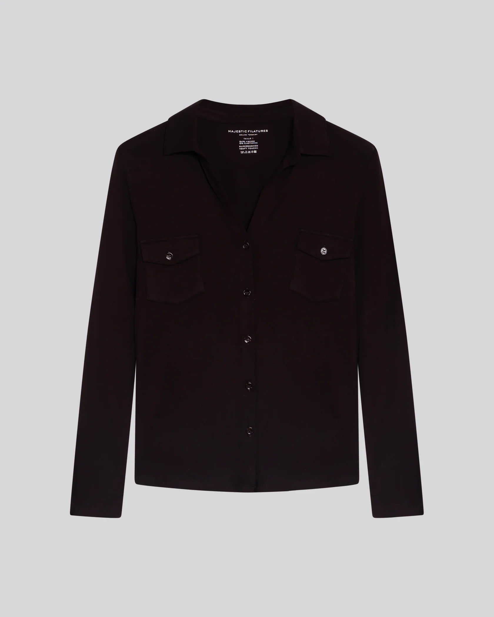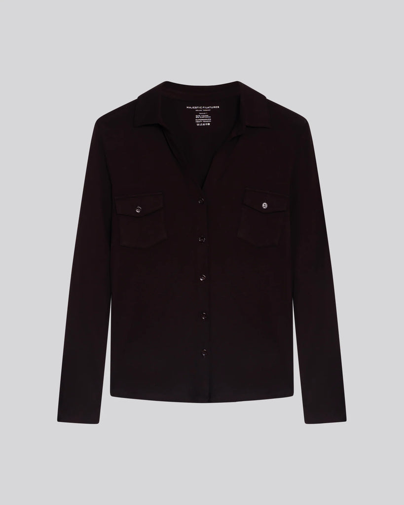 Chemise Aubergine Manches Longues en Viscose / Élasthanne, dotée de deux poches plaquées et confectionnée dans un tissu fluide et extensible qui assure confort et liberté de mouvement au quotidien.