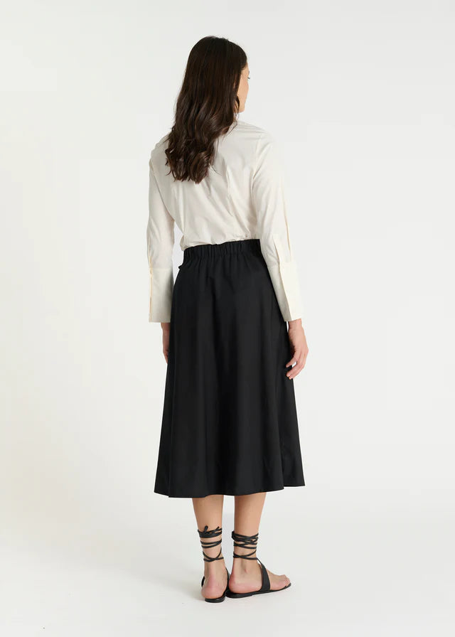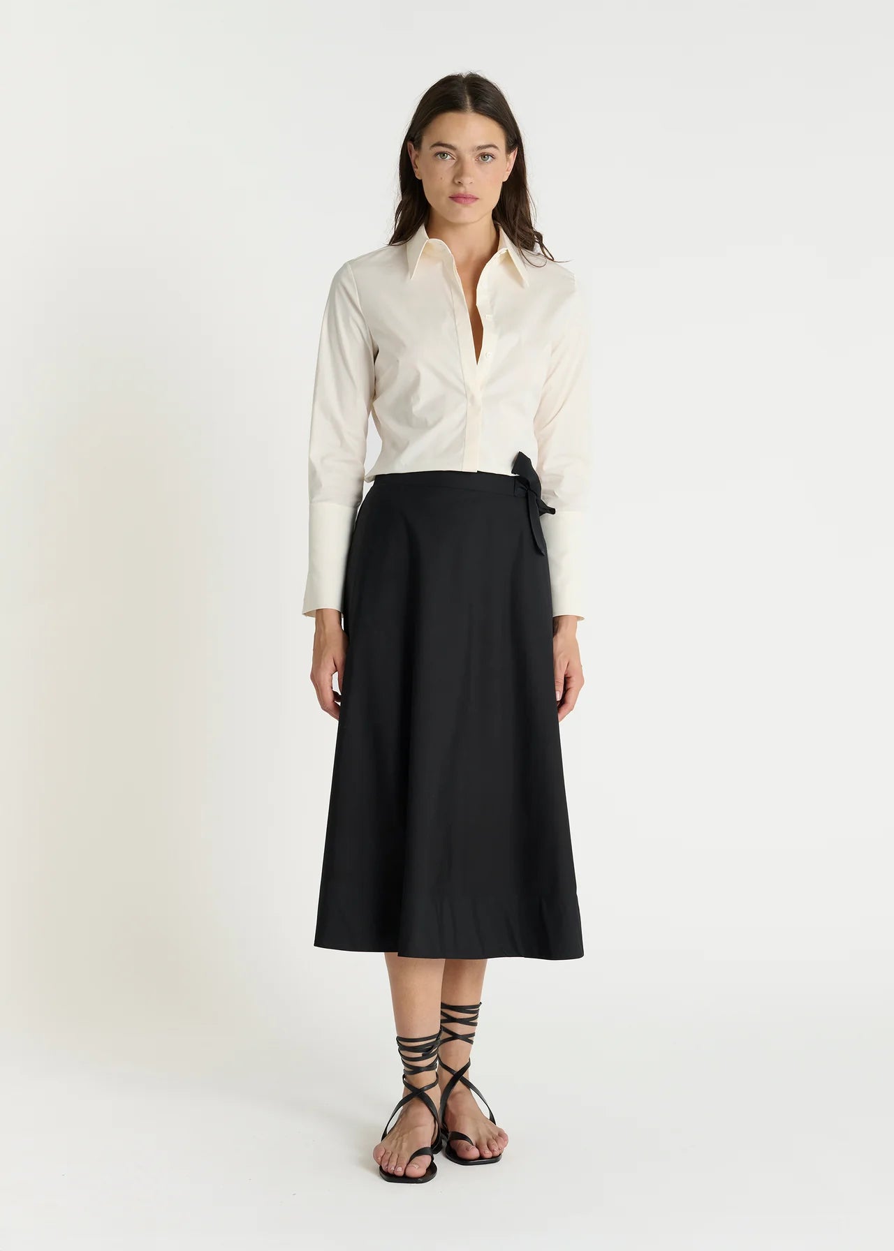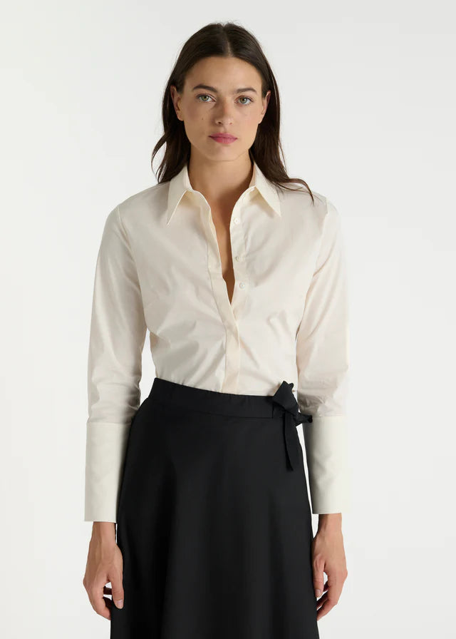 Subtile et sophistiquée, la chemise Antonia en version ivoire incarne une élégance discrète propre à Hana San. Réalisée en popeline de coton stretch, cette chemise pour femme allie douceur, tenue et confort au quotidien. Le col, délicatement fermé par dix boutons en nacre naturelle dissimulés sous une patte de boutonnage, apporte une touche de raffinement. Les manches longues se terminent par de larges poignets structurés, chacun souligné par trois boutons, pour une allure à la fois moderne et intemporelle. Avec sa coupe droite et équilibrée, Antonia s’impose comme une chemise chic pour femme, idéale pour sublimer une silhouette avec sobriété.