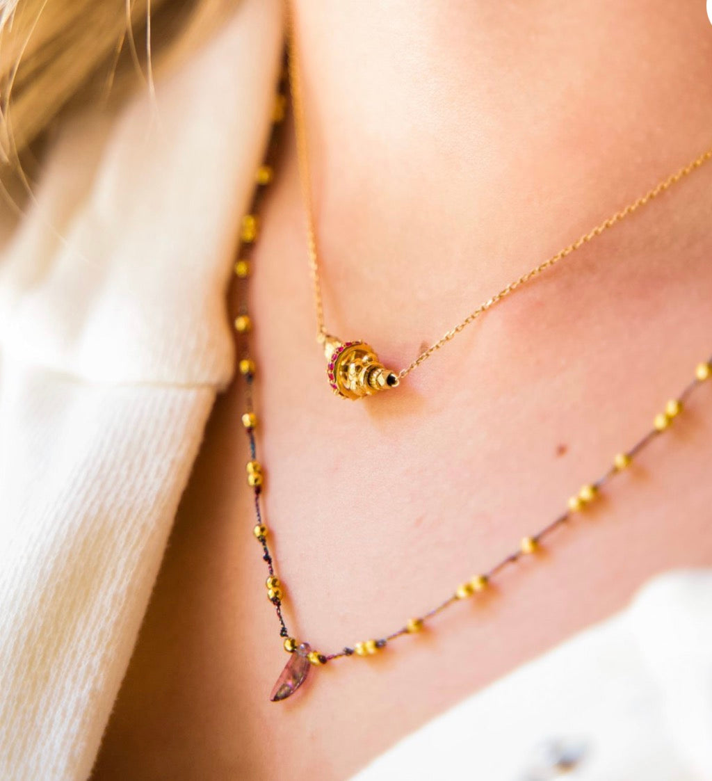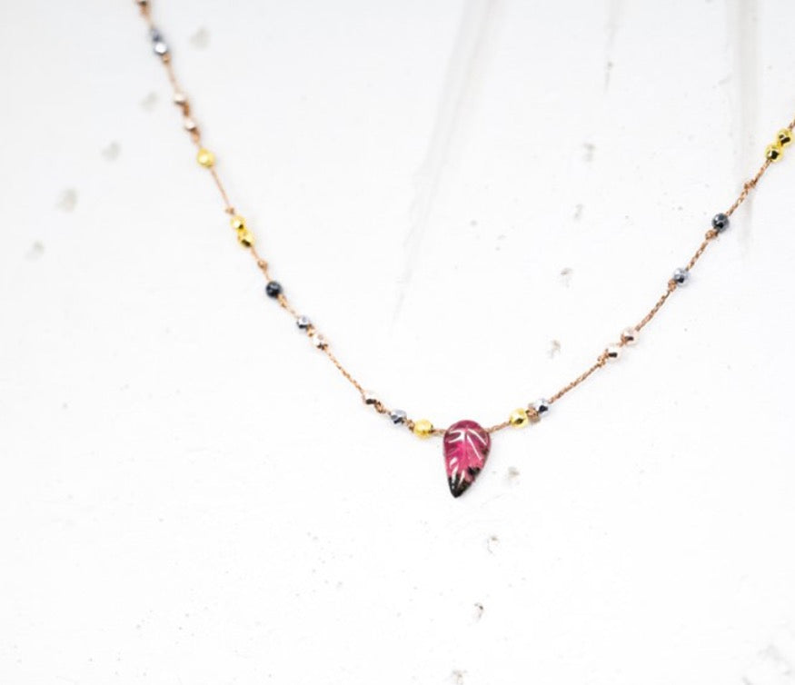 Le collier Ode est un métissage de fils de lurex, d’hématites dorées et d’une petite feuille de Tourmaline en pierre gravée.