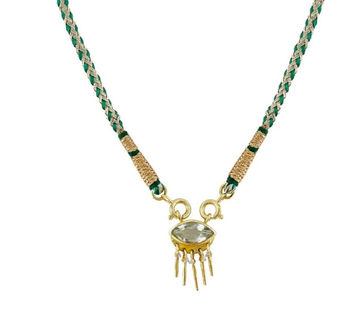Oeil et et cordon tissé vert.