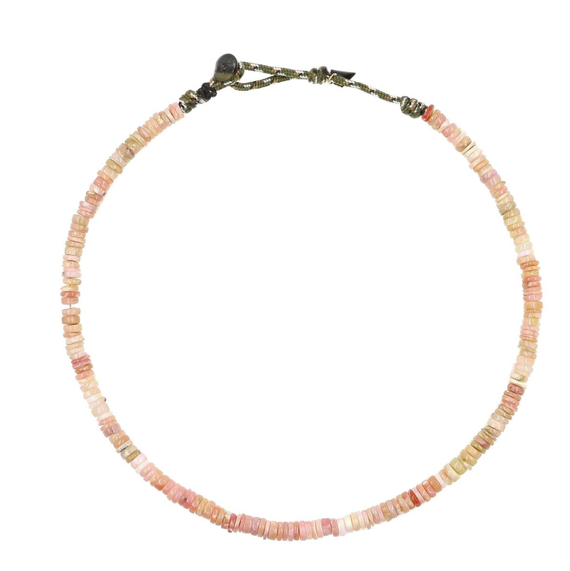 Collier Puka en opale rose. Émotionnellement parlant, l’opale a toujours été associée à l’amour, à la passion, au désir. C’est une pierre séduisante qui intensifie les états émotionnels.