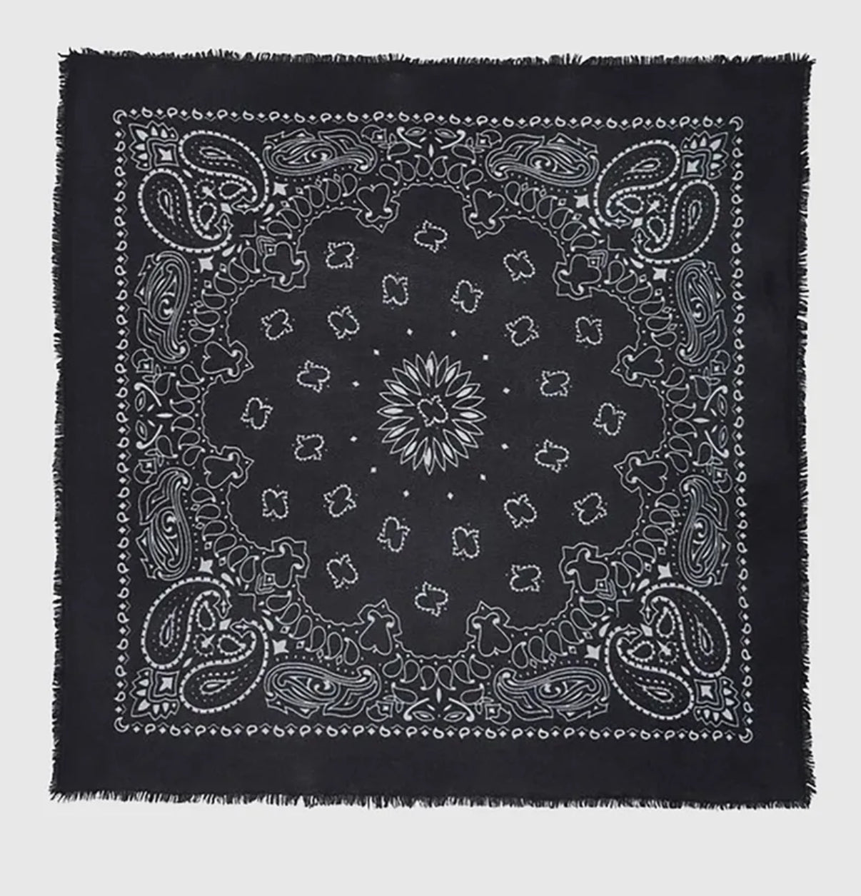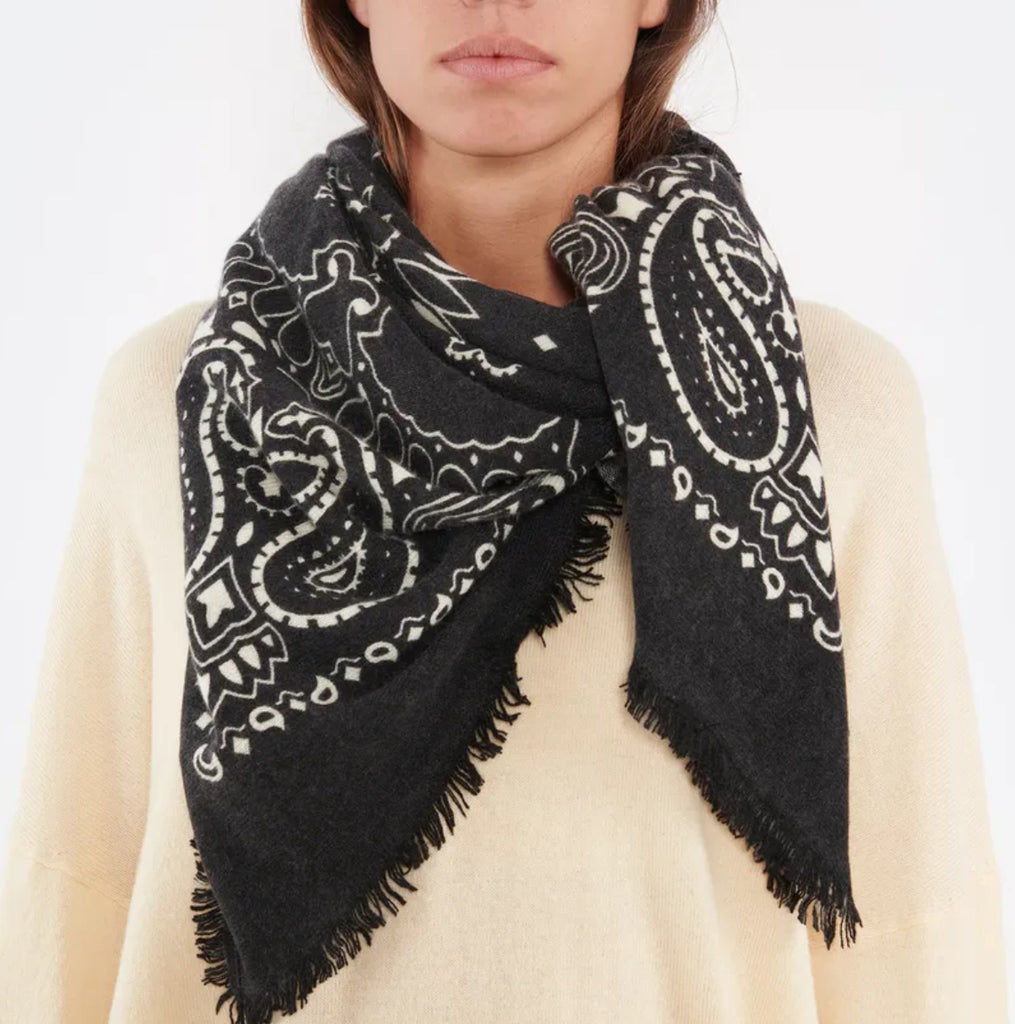Foulard en tricot jersey de cachemire noir à motif bandana blanc. Bords frangés.