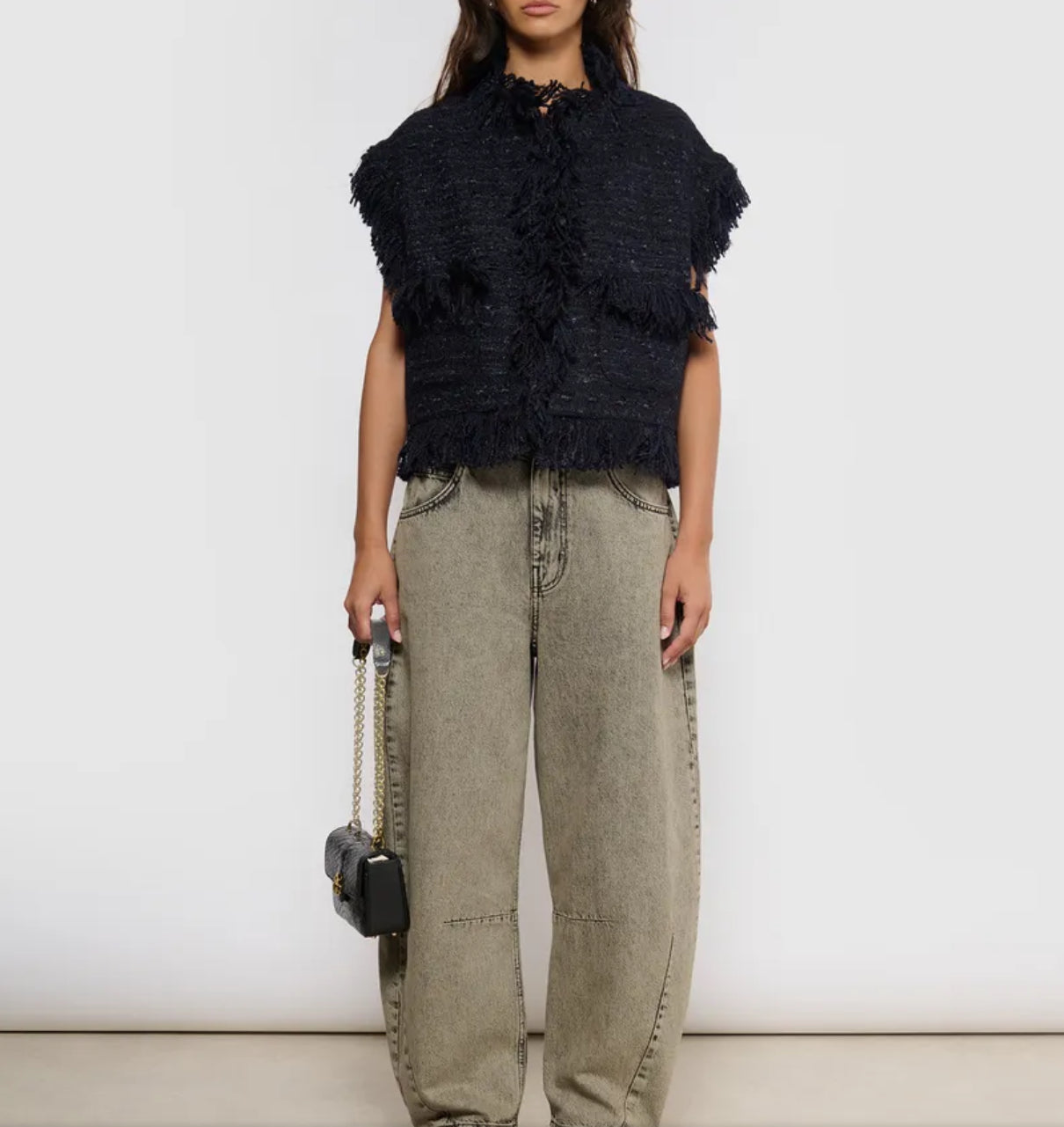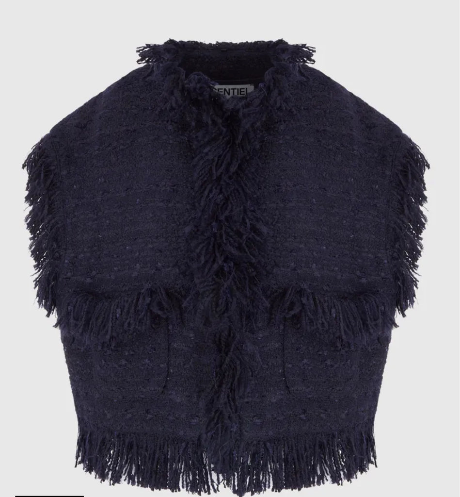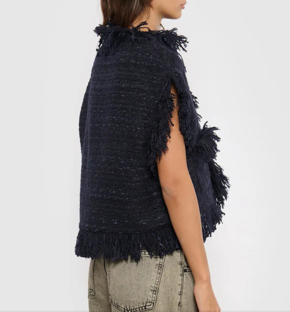 Veste courte sans manches bleu marine en bouclé de laine mélangée avec franges. Coupe boxy. Emmanchures basses. Fermeture à agrafes. Poches plaquées.