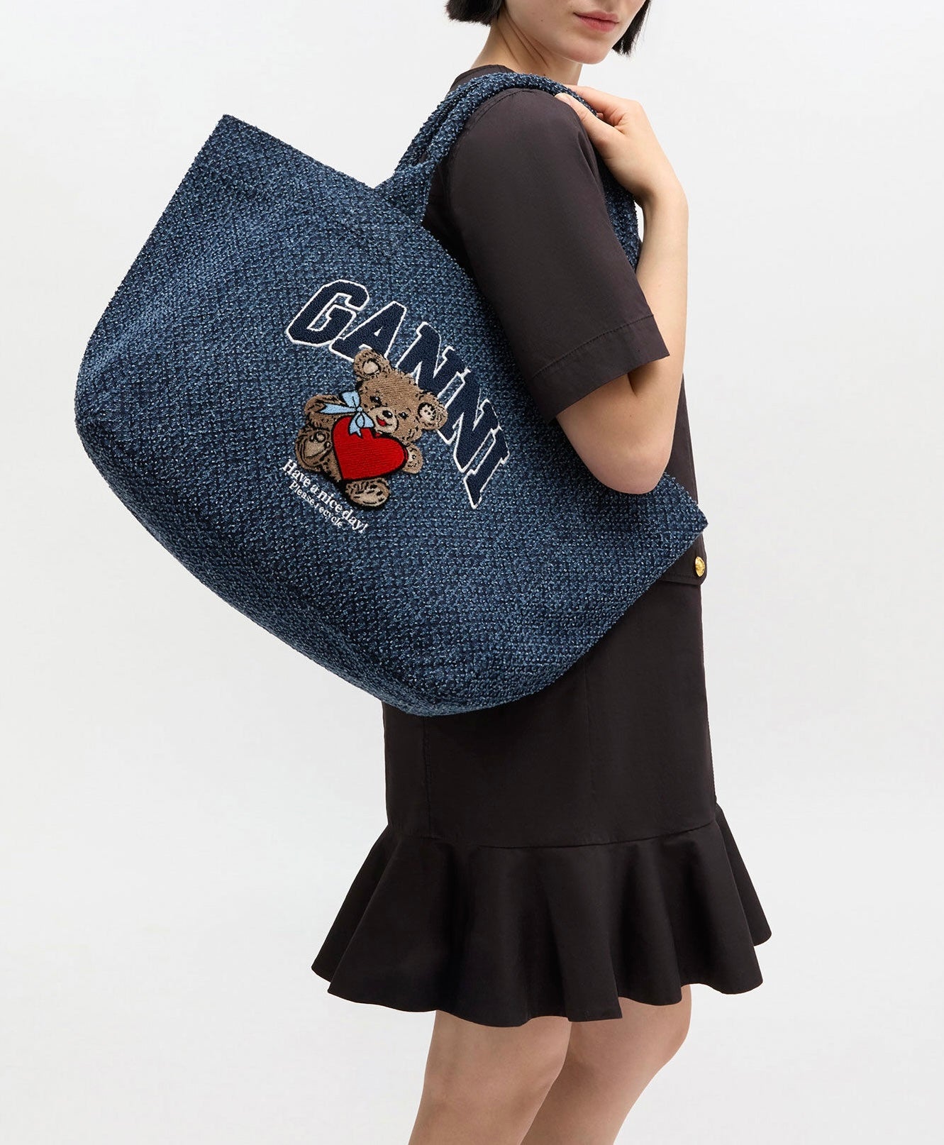 Ce sac fourre-tout présente des poignées supérieures, un grand compartiment et un logo GANNI avec la phrase « Have a nice day! Please recycle. »