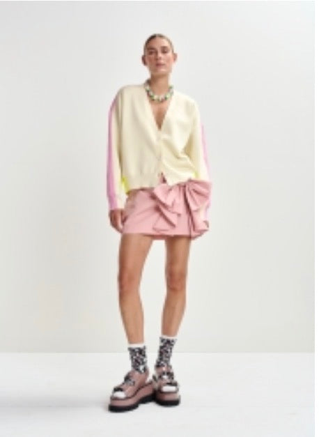 Mini-jupe confectionnée à partir d'un mélange de coton dans une coupe ajustée et légèrement évasée. Elle se porte haut à la taille et est dotée d'une fermeture à glissière dissimulée. Un nœud décoratif est appliqué du côté gauche.