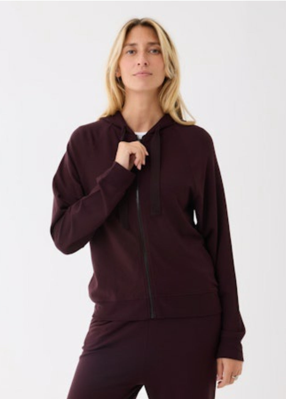 Sweat à capuche avec zip, de couleur coffee. Resserré à la taille.