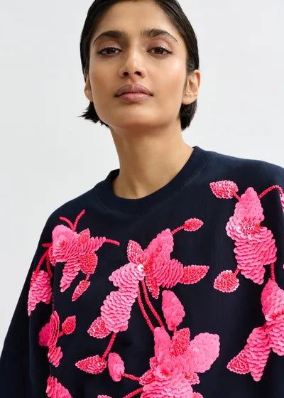 Sweatshirt en jersey de coton doux, qui adopte une coupe décontractée et une finition moderne grâce aux doubles coutures. Il rehaussera même vos journées les plus décontractées avec une touche d'éclat, grâce aux délicates fleurs brodées de perles et de paillettes.