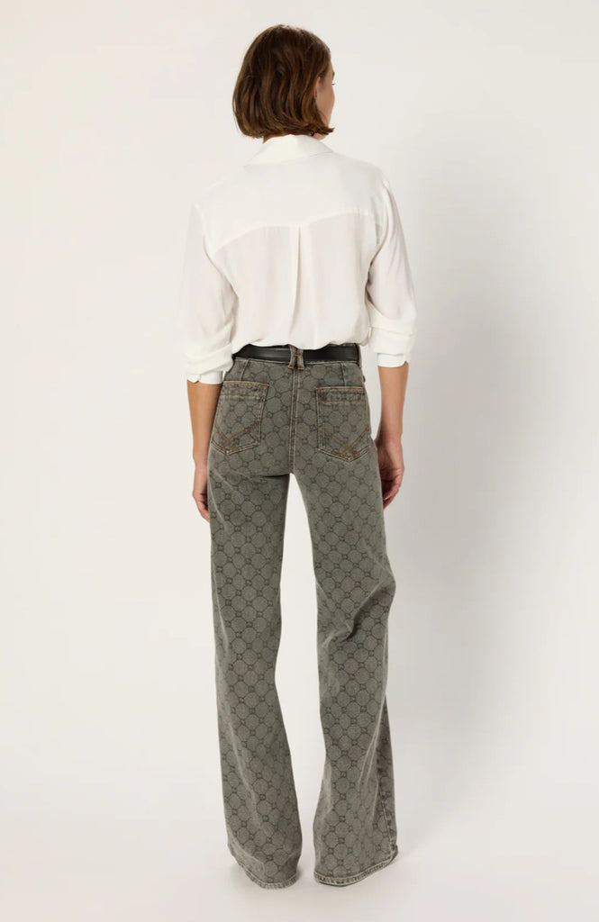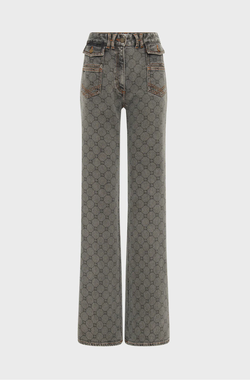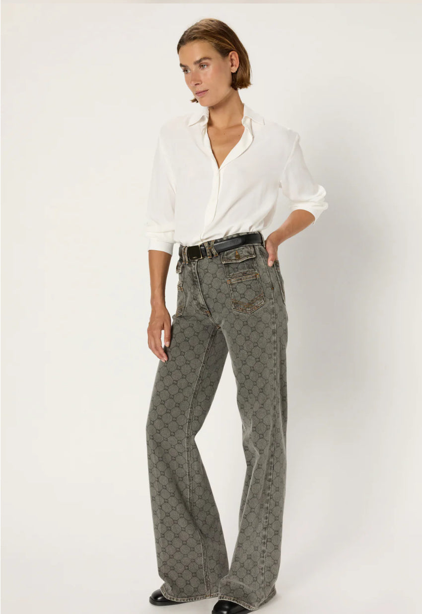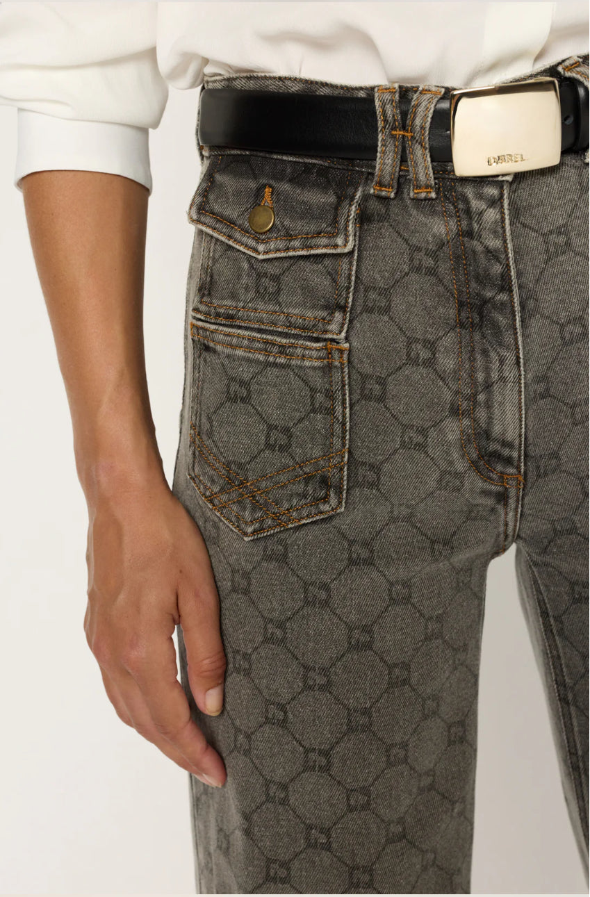 Jean flare ANNA, modèle iconique de la maison Darel, décliné avec le monogramme GD en all-over.