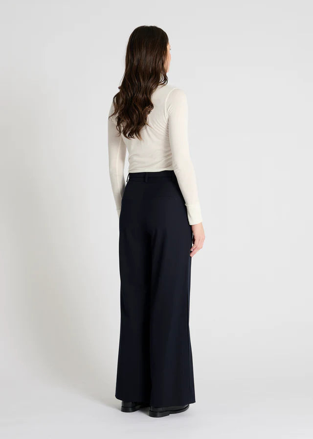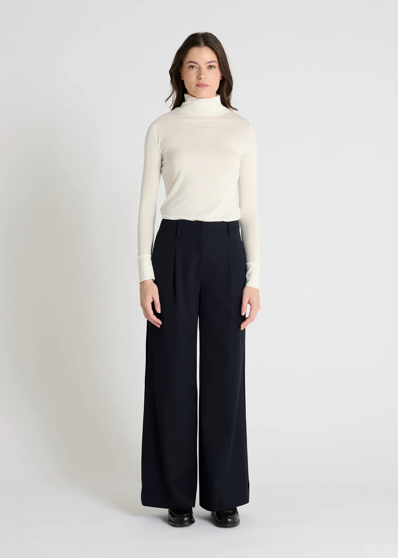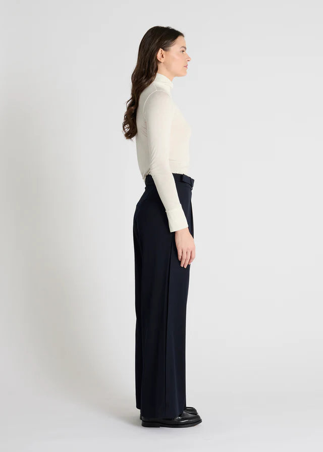 Le pantalon Bly se distingue par une silhouette fluide et moderne, confectionnée dans un tissu tailleur uni de couleur bleu nuit. Sa coupe légèrement évasée et ses plis couchés à l’avant créent un mouvement élégant, tandis que le pli creux sur la couture latérale ajoute une touche subtile de sophistication. Les passants à la taille permettent d’ajouter une ceinture si souhaité même si le modèle est vendu sans et la fermeture discrète par zip et crochet assure un maintien net et confortable. Les poches intégrées aux coutures offrent une fonctionnalité sobre, sans compromettre l’esthétique. Le bas de jambe large parachève cette pièce avec une allure aérienne, idéale pour un look raffiné et décontracté à la fois.