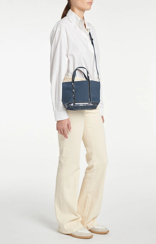 Best-seller de la maison Vanessa Bruno depuis 1998, le Cabas est ici présenté dans sa version XS. Confectionné dans une toile de coton résistante et rehaussé de sequins ludiques et féminines, cet essentiel made in France (il est aujourd'hui encore fabriqué dans nos ateliers situés près de Paris) est pourvu de deux petites anses ainsi que d'une bandoulière amovible pour un porté épaule ou en croisé. Mini, son volume réduit ne lui permet d'accueillir que l'essentiel, de votre portefeuille à votre bâton de rouge à lèvres en passant par votre téléphone portable et vos clés.