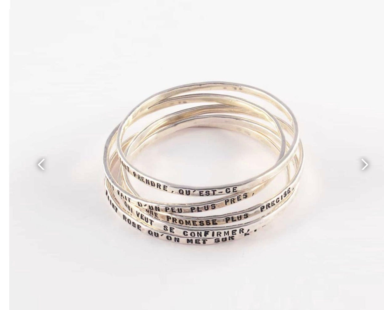 Set de 5 bracelets fins martelé en argent massif gravé d'un extrait du poème d' Edmond Rostand : Un baiser, mais à tout prendre, qu'est-ce ? Un serment fait d'un peu plus près, une promesse plus précise, un aveu qui veut se confirmer, un point rose qu'on met sur l'I du verbe aimer.