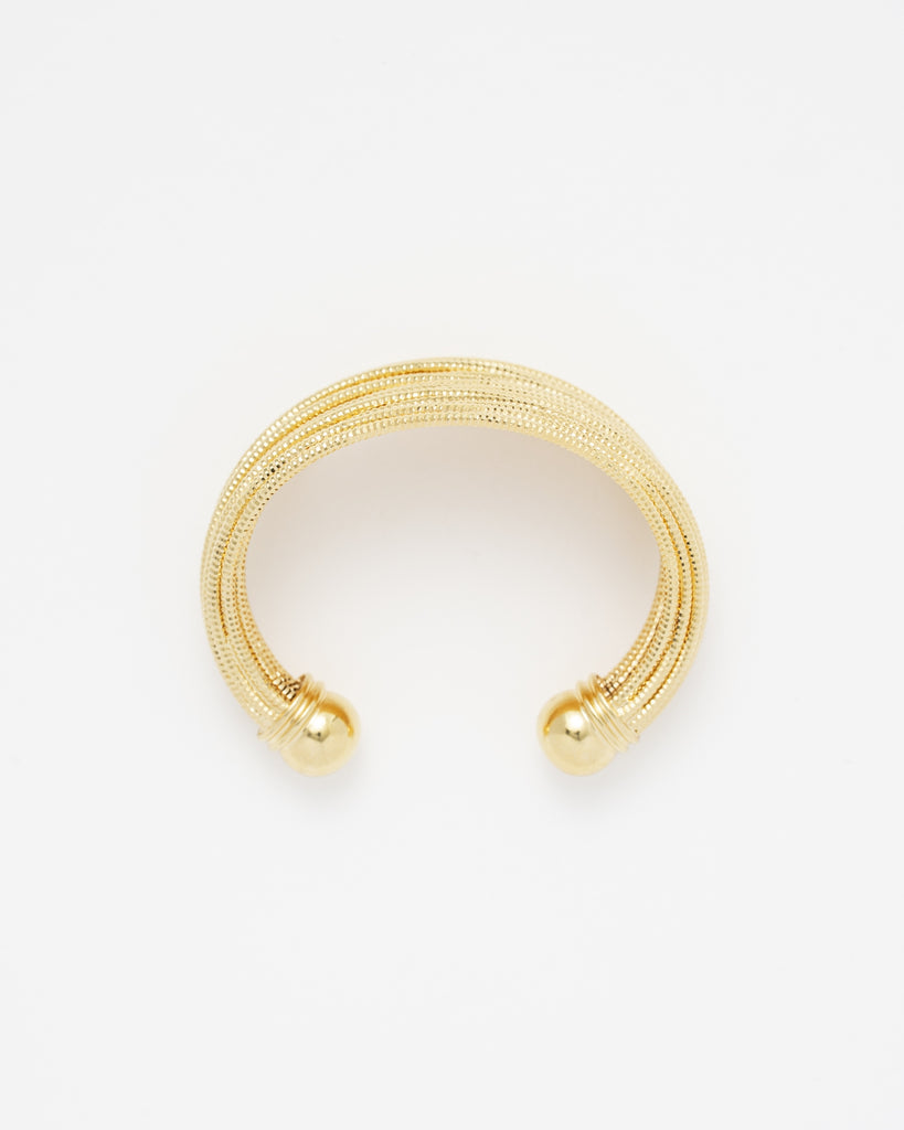 Le Bracelet Isis Shiny se compose de plusieurs rangs fins en métal doré, formant un jonc souple au design texturé.