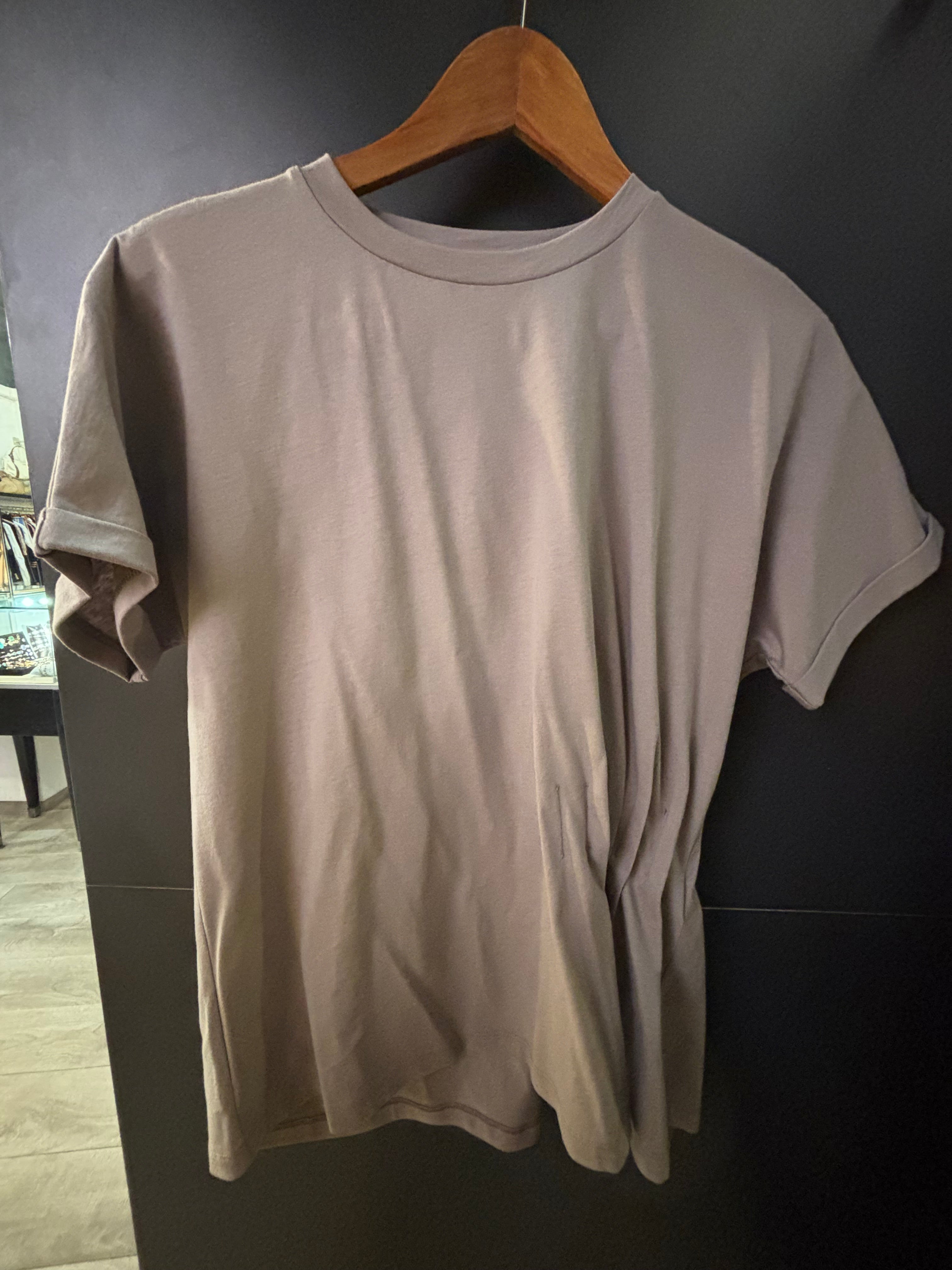 T-shirt de couleur taupe. Il a une coupe plus resserré avec des plis niveau de la taille.