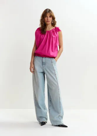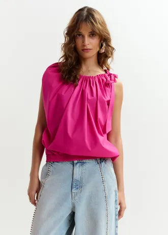 Haut sans manches qui présente une coupe décontractée. Son encolure asymétrique est accentuée par un ruban féminin. L'ourlet inférieur est réalisé en smocks pour créer du volume et assurer un bon maintien.