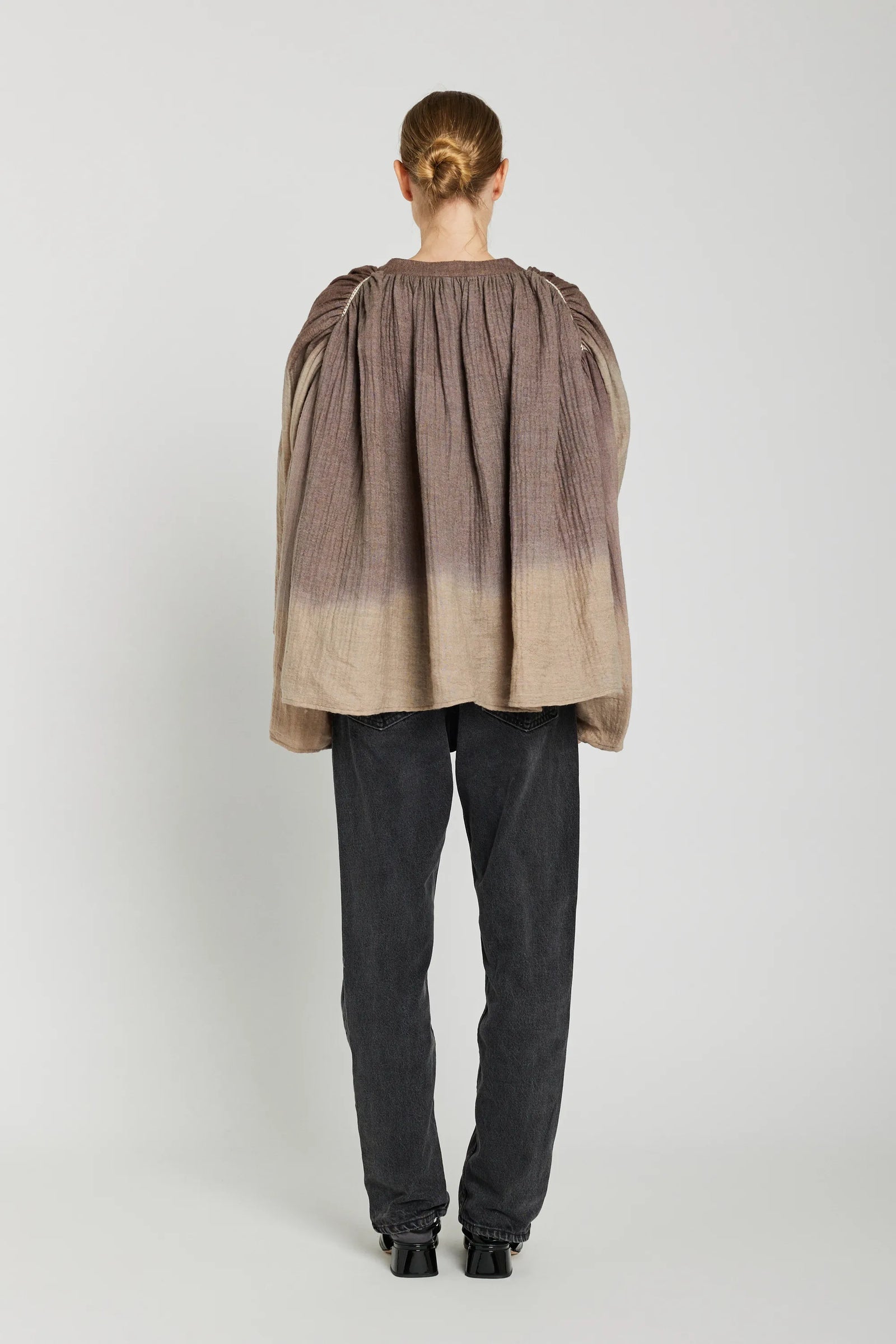 La chemise MALO en laine tie and dye marron séduit par sa coupe ample et fluide. Dotée d’un col mao, de manches larges et de boutons nacrés, elle conjugue confort et allure contemporaine avec une touche artisanale.