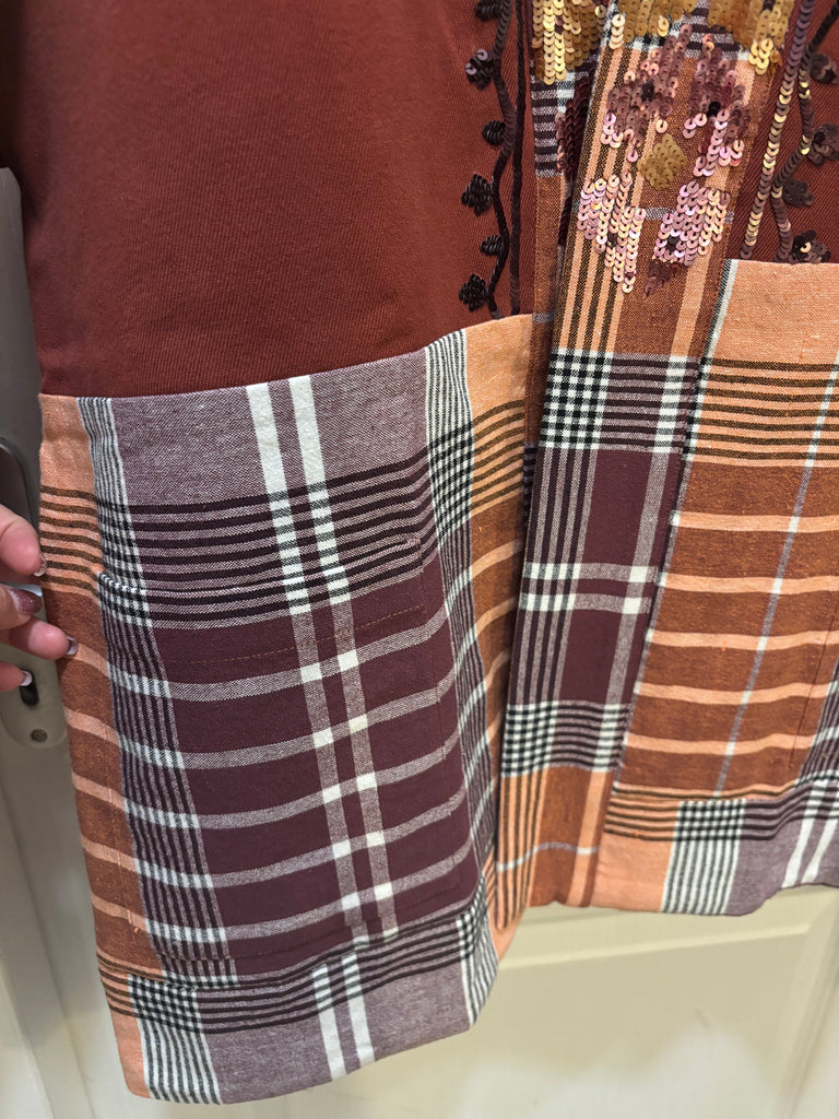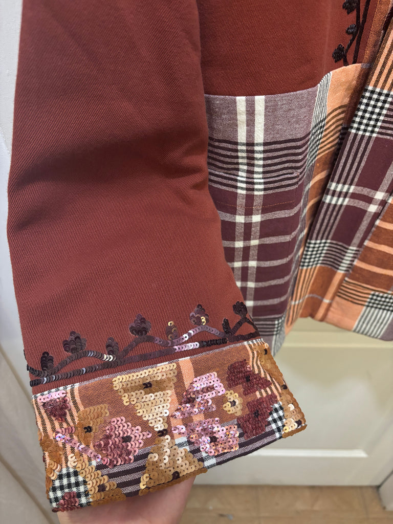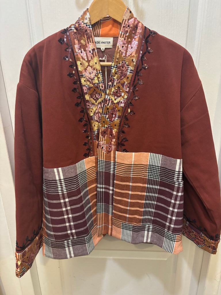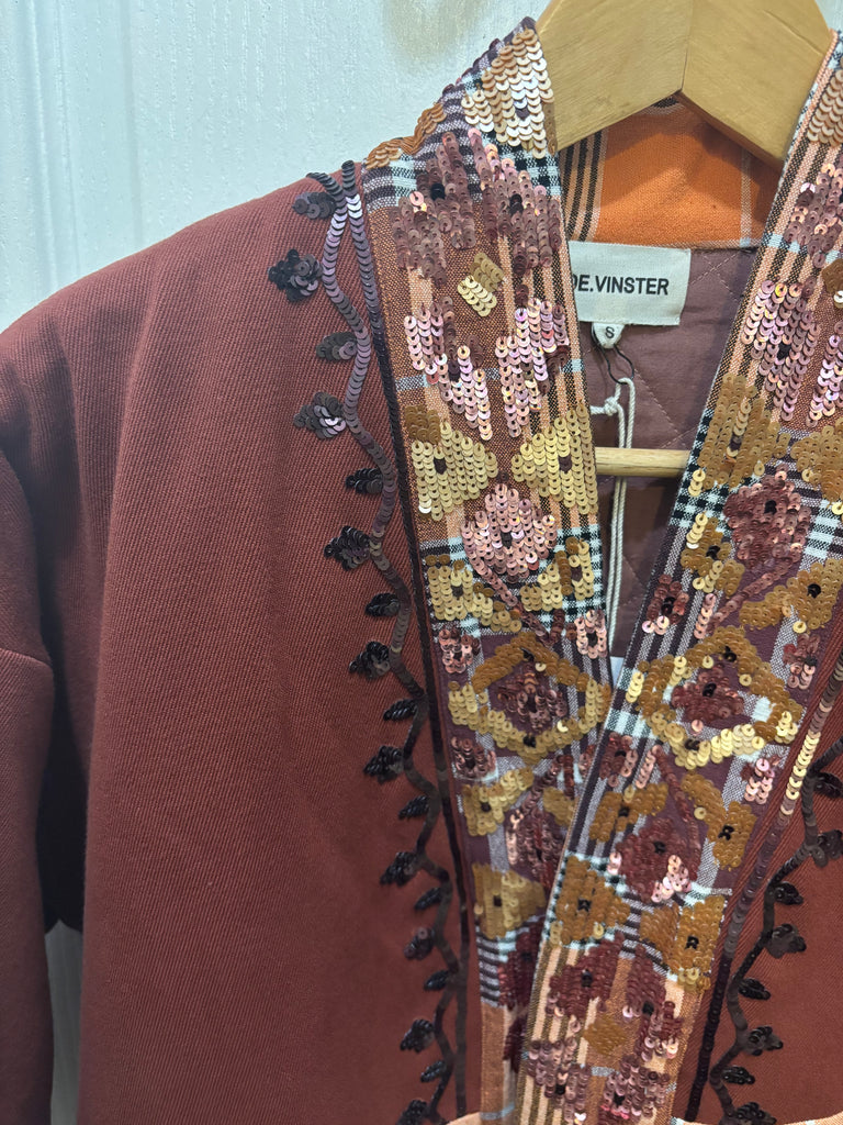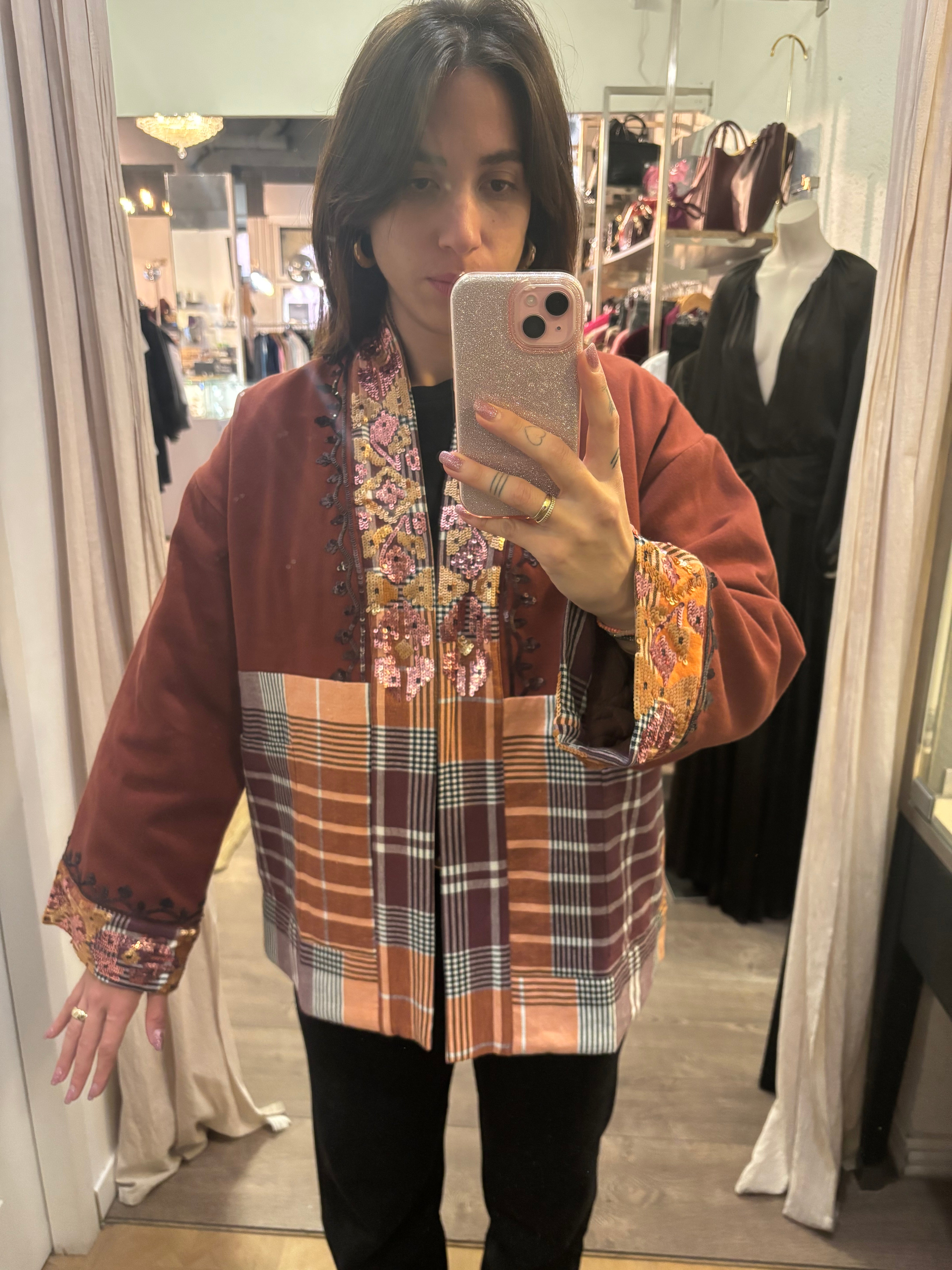 Veste Kimono couleur safran courte. Des sequins sur le col et les manches.