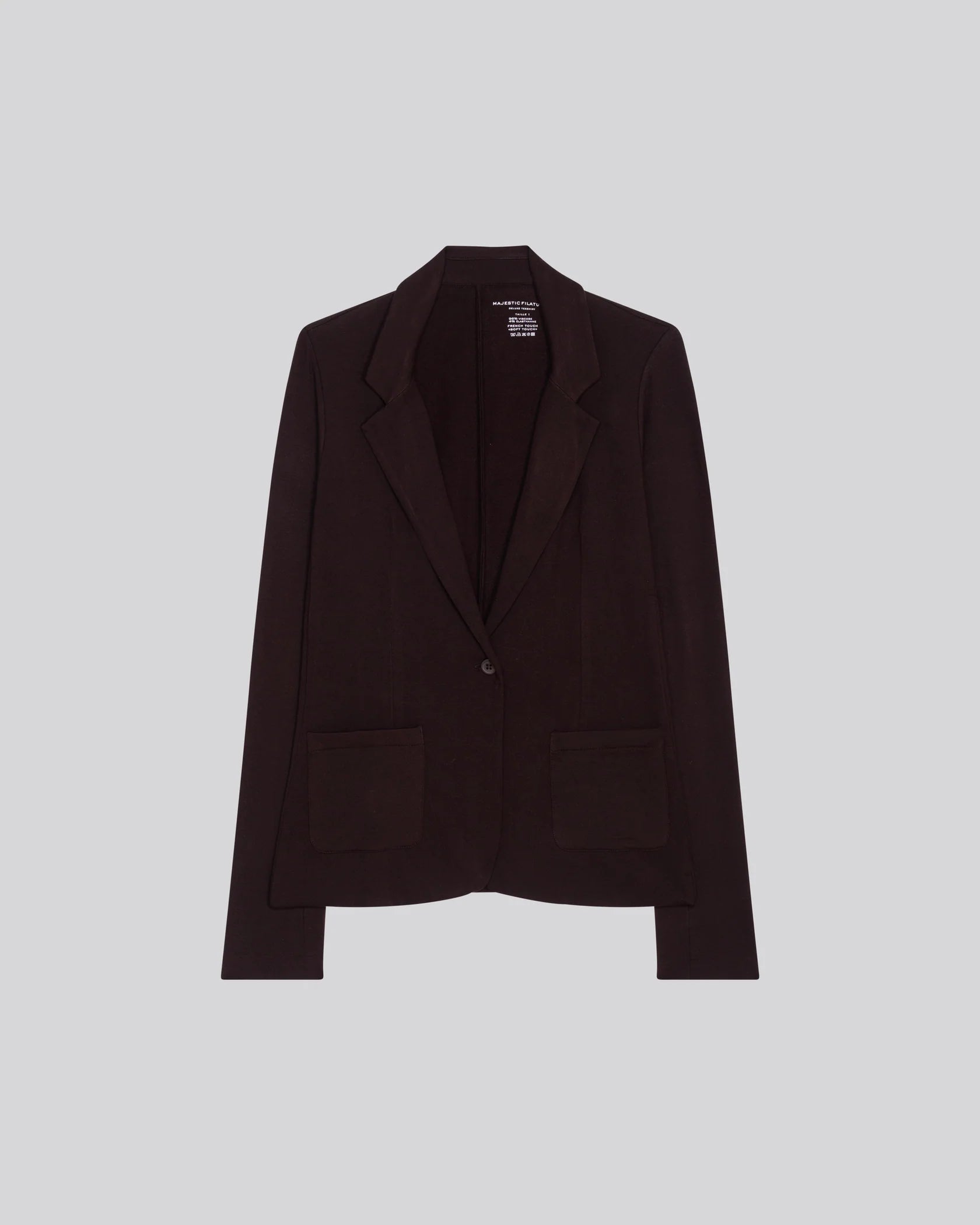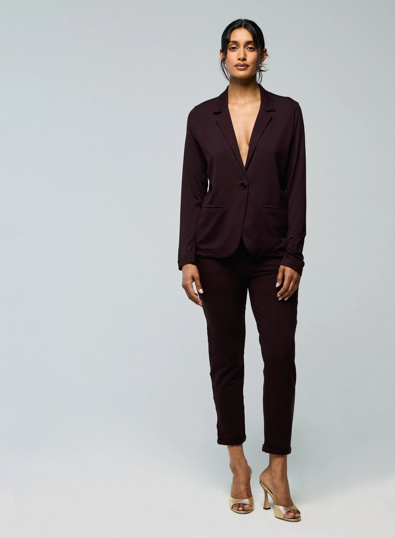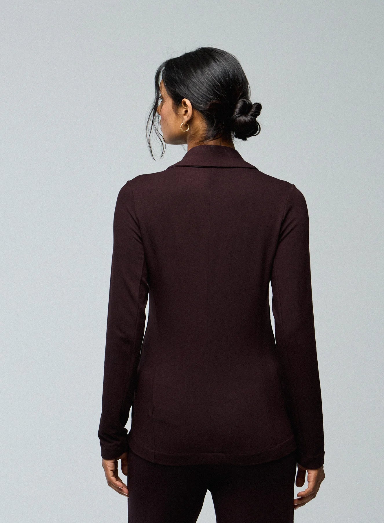 Veste aubergine à manches longues, en viscose extensible pour une coupe fluide et élégante, dans un coloris aubergine / bordeaux profond et sophistiqué.