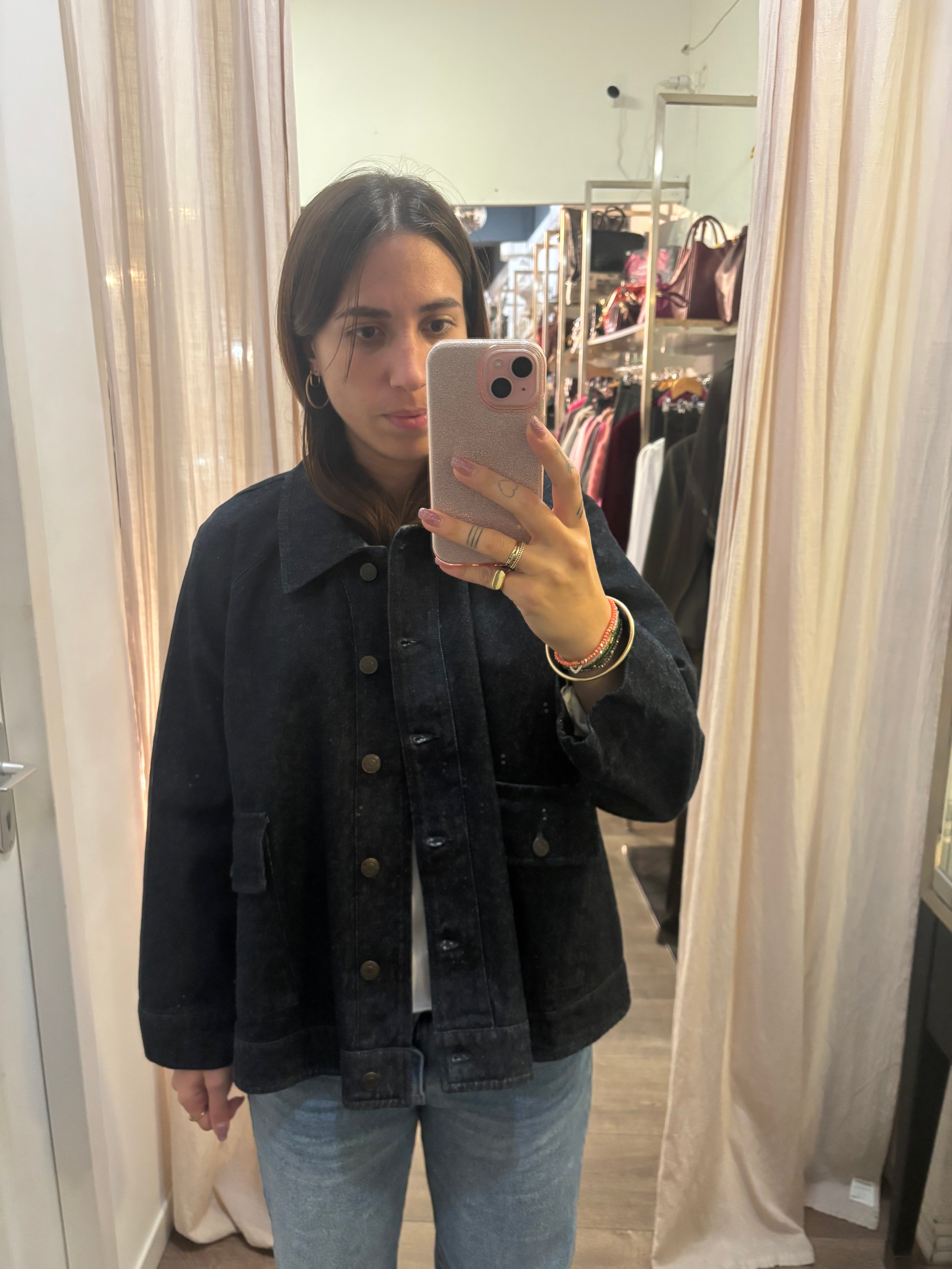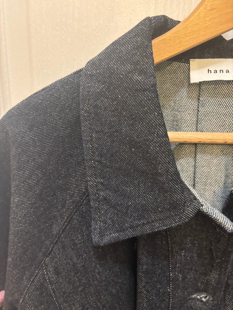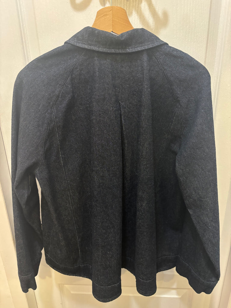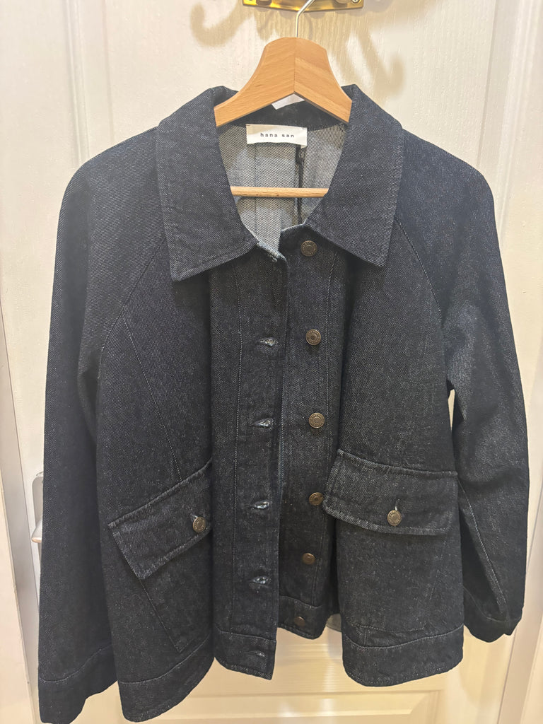 Veste en jean denim brut. Coupe qui part légèrement en trapèze, avec de larges poches