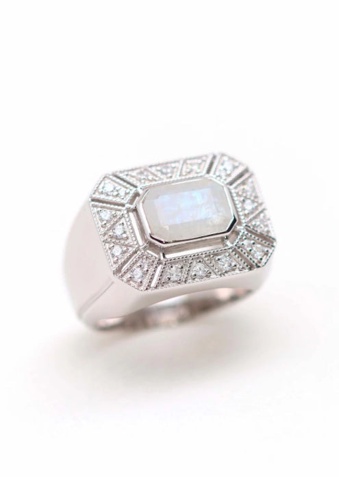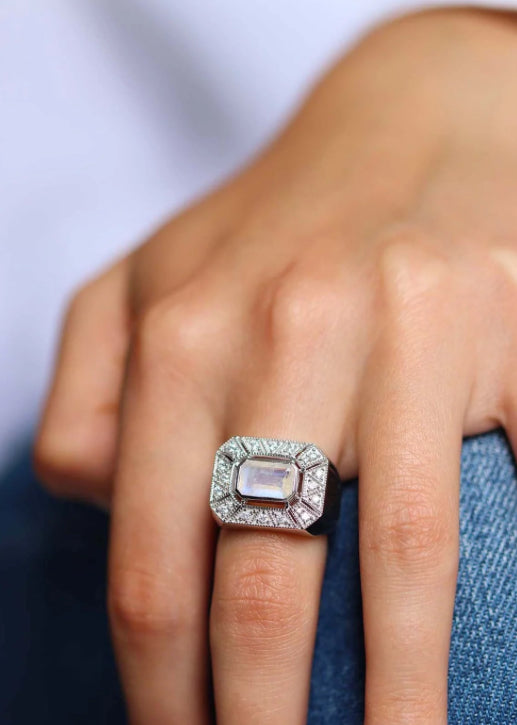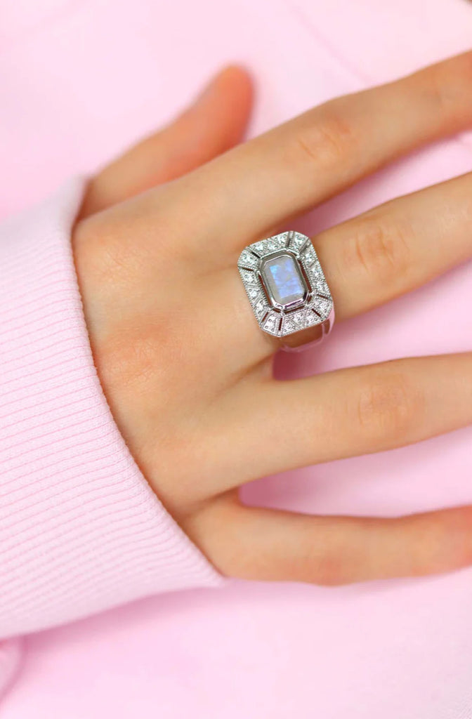 Découvrez l'élégance intemporelle de la bague Angéline, un bijou d'inspiration Art Déco qui apportera une touche de raffinement à votre style. Cette bague en argent 925 est ornée d'un pavage géométrique ouvragé de millegrain, une technique emblématique de l'époque Art Déco qui met en valeur la pierre de lune facettée en son centre. Les reflets irisés de la pierre de lune, combinés à la finesse du millegrain, font de cette bague une pièce unique et féminine.