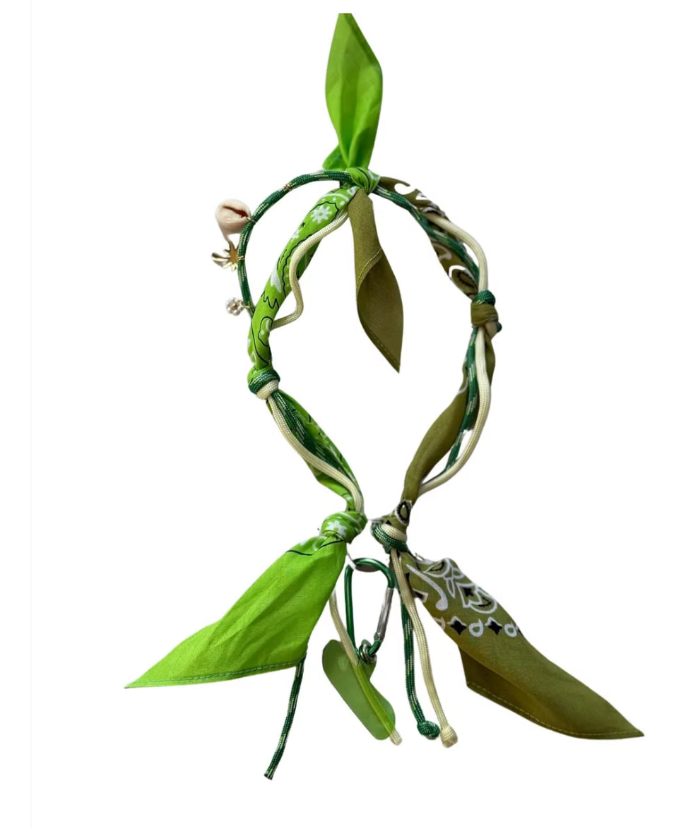 Dragonne en patchwork de Bandana de coton vert/olive. ses paracordes et ses grigris: fleur perles , palmier doré coquillage et son œil doré. Son mousqueton permet de clipser l’attache au téléphone. Attache fournie. Se porte au poignet uniquement. Vendu dans sa pochette rose. Dimension ~45 cm