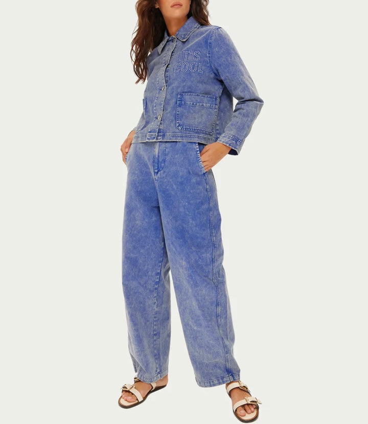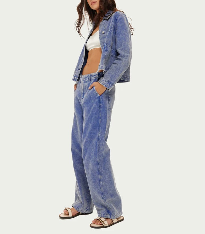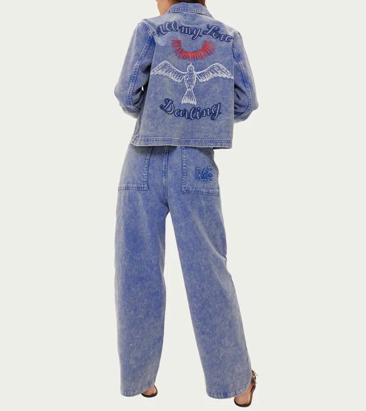Ce pantalon en denim délavé à l'acide, couleur indigo moyen, présente une coupe ample et décontractée, rehaussée d'une discrète broderie « Me » sur la poche arrière.