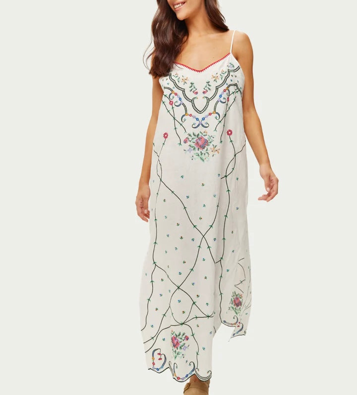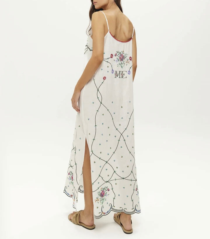 La robe nuisette Lauren est ornée de délicates broderies florales inspirées de motifs anciens cousus à la main, où des vrilles forment un élégant treillis sur le tissu.