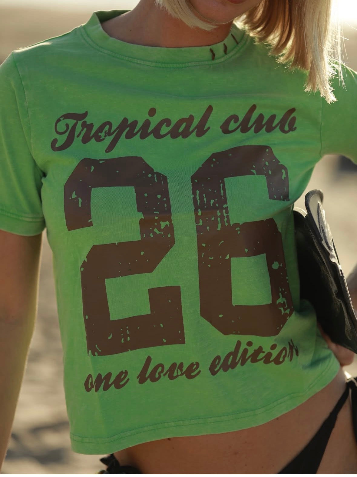 T-shirt vert, avec imprimé universitaire. La coupe est plus près de corps et le col est rond.