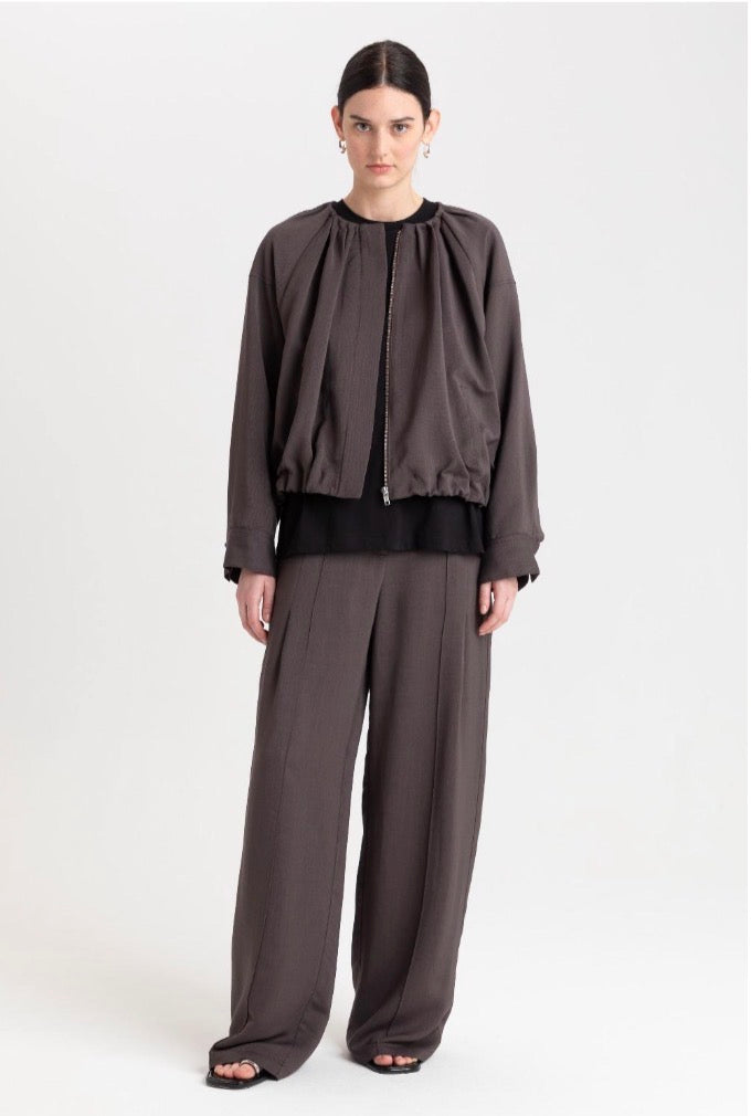 Veste col rond, de couleur chocolat, coupe de type bomber resserrée vers le bas.